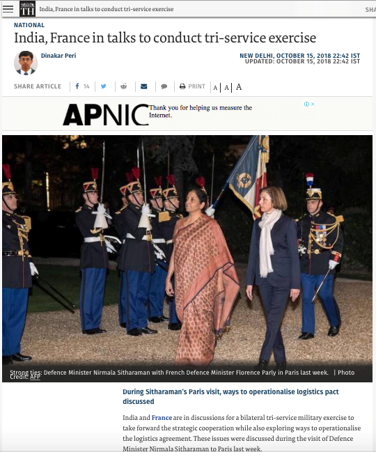 10月15日,印度官方对外宣布,印度已和法国就两国明年的三军军事演习达成协议。上周,印度国防部长Nirmala Sitharaman访问法国。今年3月,印度和法国签署协议,允许两国军队为后勤保障使用对方的军事基地。除法国外,印度分别于去年10月与俄罗斯、 明年与美国举行三军联合军演。
