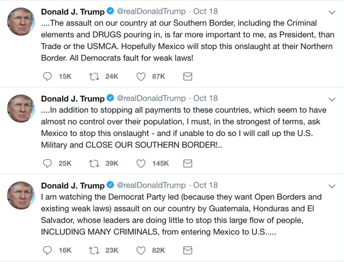 在“移民大军”跨越萨尔瓦多、危地马拉边境,距离美国南部还有1600公里之时,特朗普的“怒火”就开始了。