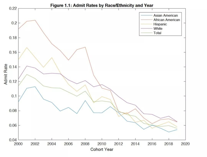 阿西迪亚克诺的报告显示哈佛亚裔的录取比例总体低于平均水平,并呈下降趋势。