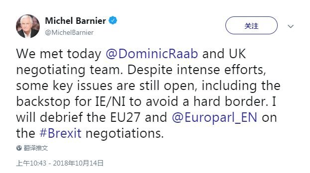 △ 10月14日,欧盟负责脱欧事务谈判的米歇尔·巴尼耶发布推文 来源:推特