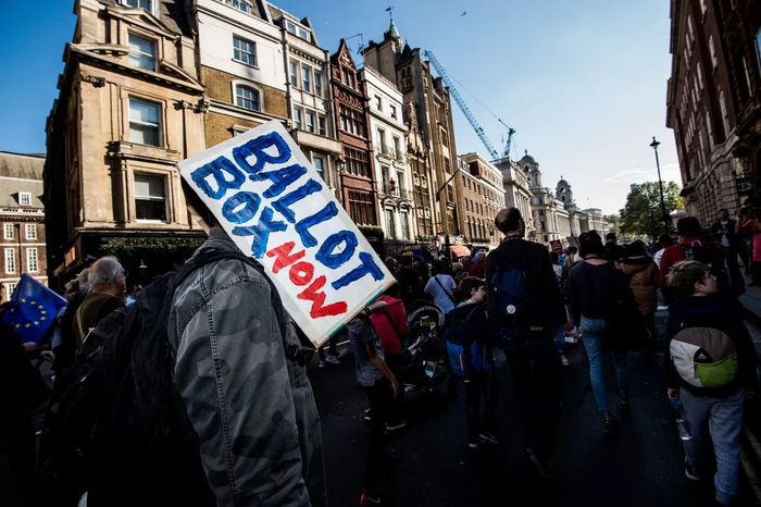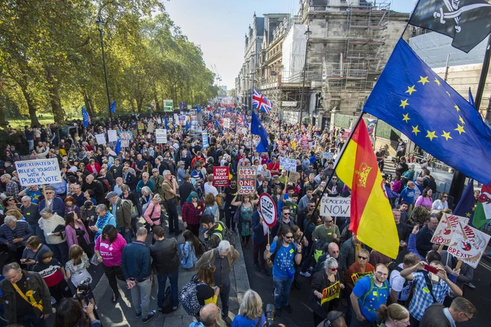 △ 当地时间2018年10月20日,英国伦敦,67万英国民众20日下午汇集在伦敦议会广场举行“人民投票”示威游行活动,呼吁对英国脱欧最终协议举行全民投票。 来源:视觉中国
