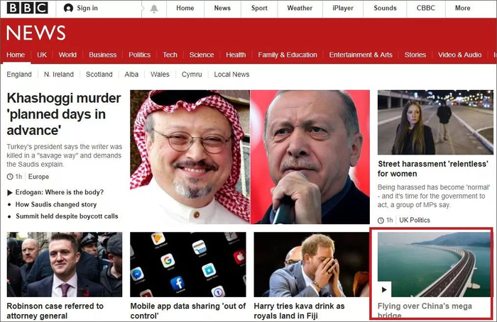 而且到圈哥发稿前,让歪国胖友们能直观领略到港珠澳大桥魅力的视频,都还挂在BBC News首页的显眼位置▼