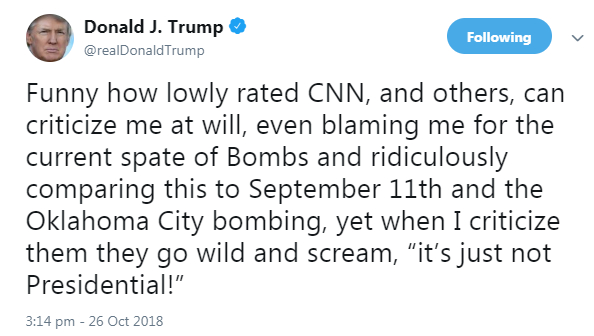 特朗普说,“真滑稽,评价扑街的CNN和其媒体可以随意批评我,甚至指责我造成了最近频发的炸弹包裹事件,还把这事跟911和俄克拉何马城爆炸案相提并论。然而我一批评他们,他们就发狂似地说我‘不像个总统’!”