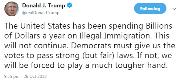 “美国每年都要在非法移民问题上花费数十亿美元。这种情况不能再继续下去。民主党人必须投票来通过强有力(而且公平)的移民法。否则,我们将不得不采取更为强硬的手段。”