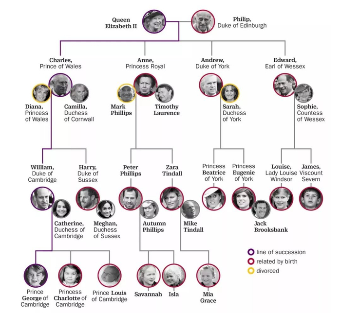 这样就可以很清楚地看见,按照传统的继承顺序,王位继承人依次是紫线上的查尔斯王储、威廉王子和乔治小王子。