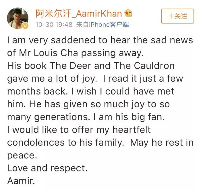 听闻金庸去世的噩耗,我非常难过。 他的《鹿鼎记》带给我很多欢乐。我几个月前才读过这本书,真希望能见到他。他为一代又一代人带来如此多的快乐,我是他的超级粉丝。我向他的家人表示衷心的哀悼,愿他安息。 再次表达爱与尊敬。 阿米尔。