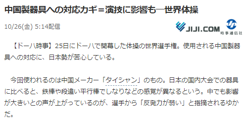 报道中声称,此次体操世锦赛使用的是中国制造的“泰山”牌器材,和平时日本所使用的器材相比,反弹力比较低,选手们很不适应。