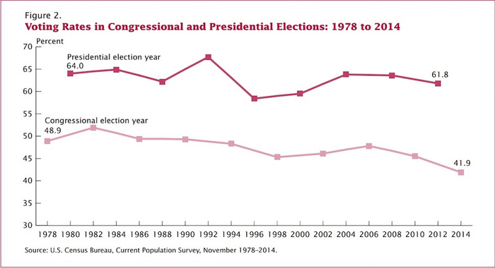 (1978至2014年间的大选(总统选举)年与中期选举年(此图将其称为国会选举年)的投票率趋势(美国人口普查局))
