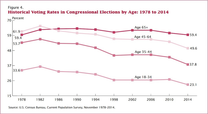 (1978至2014年间中期选举的投票率与选民年龄的关系,年轻人的投票率明显低于其他年龄段的选民,不到45岁以上选民的一半(美国人口普查局))