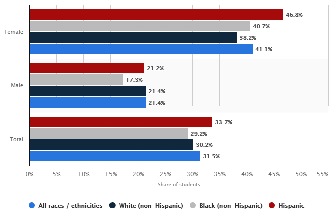 事实上,美国高中生群体中有抑郁倾向的人群也不在少数,其中也包含了各个族裔的学生。所有族裔的女学生抑郁倾向达到了41.1%,有抑郁倾向的男性学生达到了21.4%,总体而言,所有族裔学生有抑郁倾向的达到了31.5%。而白人学生、黑人学生的抑郁比例实际上差不多已经和平均水平持平。