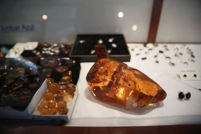 这是5月3日在多米尼加首都圣多明各的琥珀博物馆拍摄的琥珀和蓝珀。多米尼加盛产琥珀,同时也是世界珠宝极品——蓝珀的主产地。新华社记者淡航 摄