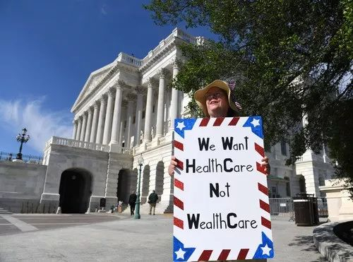 2017年6月27日,一名女子在美国华盛顿国会山抗议医改法案。新华社记者殷博古摄