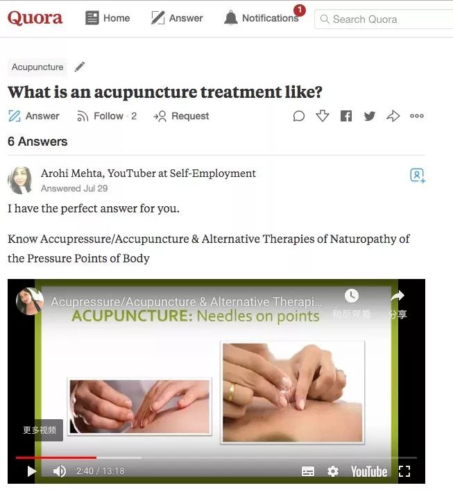 在美国问与答网站Quora上,当有人问到“针灸的科学依据是什么?”时,不少热心的外国网友找出了学术期刊上关于针灸疗法的讨论文章。更有针灸“忠实粉丝”制作介绍针灸的视频放到Quora上向网友们安利。