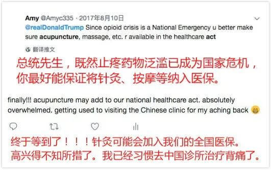 在社交媒体和论坛上,大批美国人一直在呼吁将针灸纳入“联邦医保”范畴。难怪这一次得知法案被签署后,有人难掩激动地在网上留言道:“终于等到了!针灸可能会加入我们的全国医保。高兴得不知所措了。我已经习惯去中国诊所治疗背痛了。”