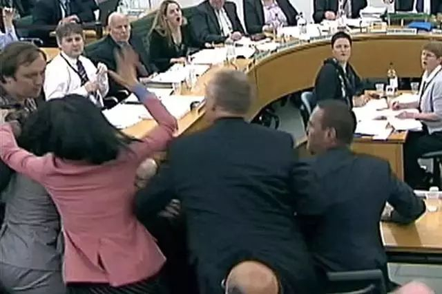 如果说有哪一个时刻,能让邓文迪的解释得到充分的论证,那就是2011年7月,默多克在英国国会下属委员会的听证会上,为电话窃听丑闻作供。邓文迪穿着一件粉红色上衣,坐在他身后。此时,一名扔蛋糕抗议者袭击丈夫时,她本能地从椅子上跳了起来,勇敢地保护了她的丈夫。