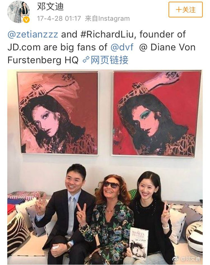 远的不谈,就在去年4月,邓文迪自己还发微博配上了刘强东夫妻的照片。这是他们一起参加知名时装品牌DVF的活动,当然DVF的品牌的创始人也跟他们在一起。