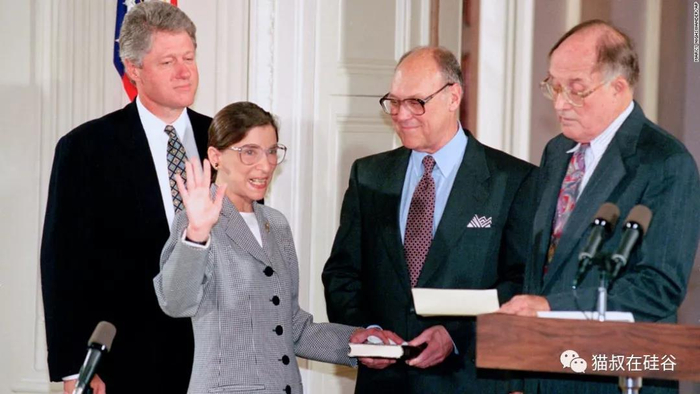 正因为金斯伯格为争取和保护女权领域的杰出贡献,1993年她获得克林顿总统提名进入最高法院,在参议院投票表决中获得了96票的压倒性支持。向克林顿推荐她的正是美国第一位女性司法部长雷诺。有趣的是,虽然克林顿总统本人多次被指控玩弄女性,但他的政府却给女权平等带来了最大的贡献。