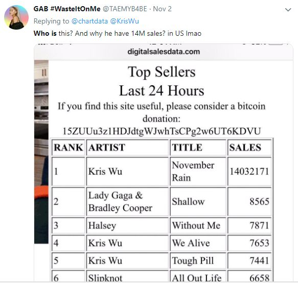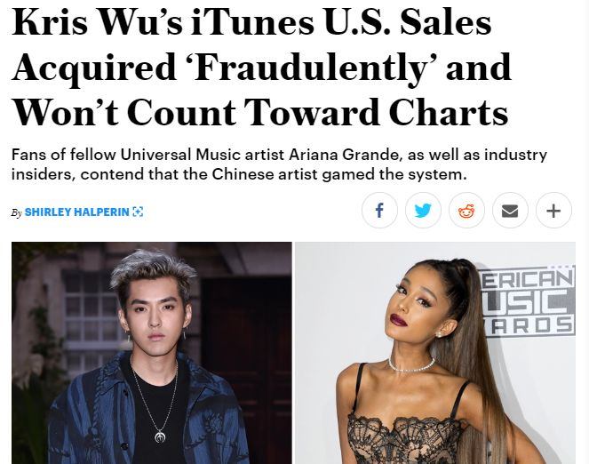 Billboard官方也在社交网上回应:“Kris Wu iTunes-topping sales are under review(Kris Wu的iTunes登顶销售榜首正在审查中)”。