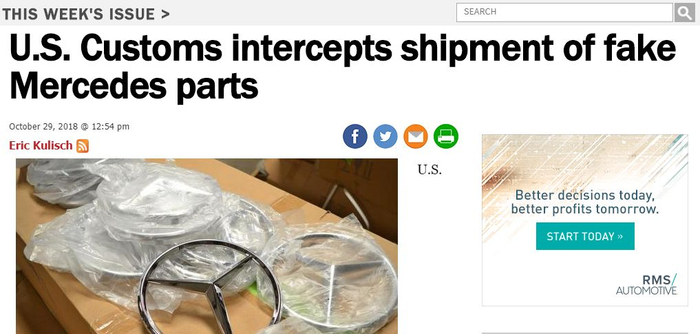 上个月17日,美国海关和边境保护局在费城也查获了一大批冒牌梅赛德斯-奔驰汽车零部件,发言人表示,这些零部件是从中国经由新泽西州纽瓦克港运来的。如果这些被查获的假部件按真实版本来计算的话,零售市场价值足足能够达到176万美元。