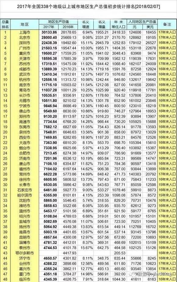 2017年大陆大中城市GDP排行榜