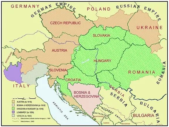 奥匈帝国的领土分属于今日奥地利、匈牙利、捷克、斯洛伐克、波兰、乌克兰、罗马尼亚、意大利、斯洛文尼亚、克罗地亚和塞尔维亚等国。