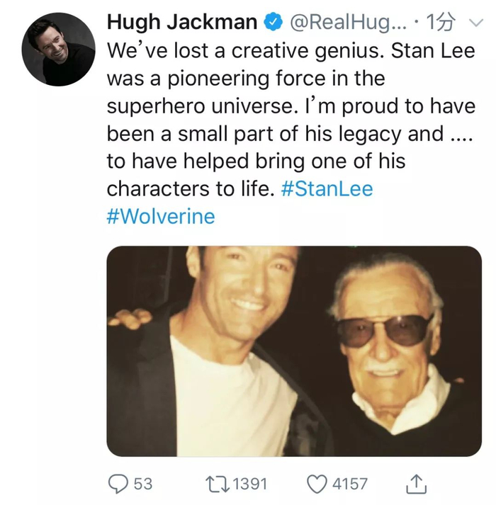 “金刚狼”休·杰克曼:“我们失去了一个创意天才,斯坦·李是超级英雄界的先锋力量。我很骄傲能成为他的遗产的一小部分……能帮助把他的角色之一变得鲜活。”↓↓