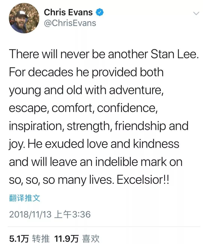 斯坦·李去世的消息传出后,美国的“超级英雄”们也纷纷发文缅怀。美国队长扮演者克里斯·埃文斯悼念:“不会再有另一个斯坦·李了。”↓↓