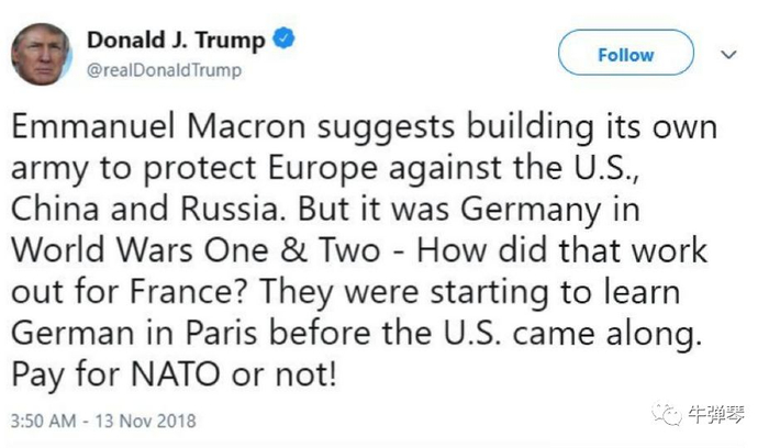 第一件事,就是马克龙要建立欧洲军队,要防范美国。特朗普真有点勃然大怒。在和马克龙会谈前,就怒斥此举“非常侮辱”美国。马克龙的解释,似乎也没有平息他的愤怒。他的对策,就是逼欧洲赶紧交北约份子钱,否则他没完。