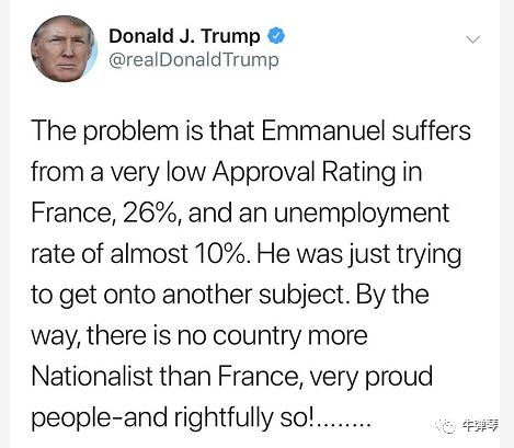 第二,做特朗普的盟友和朋友,有时真挺难的。今年去加拿大出席七国峰会,最后也是特朗普拂袖而去,还在“空军一号”上,特朗普就发推特痛骂加拿大总理特鲁多“太虚伪太弱小”。这次兴冲冲去法国,又跟马克龙算彻底闹掰了。但特朗普还委屈呢:微斯人,吾谁与归?