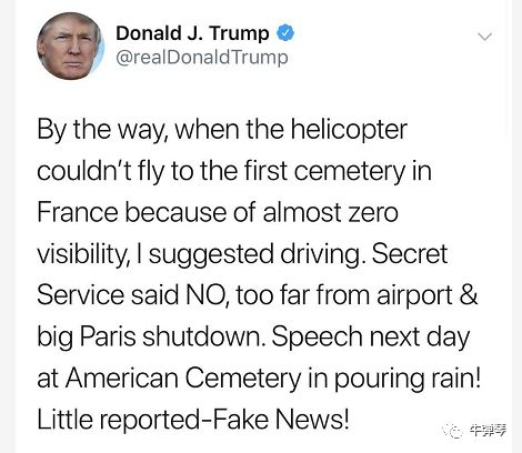 顺便说一句,因为过低的能见度,直升机无法起飞赴第一个美军公墓,当时,我曾建议乘车前往。但特勤局说不,那儿离机场太远了,会导致整个巴黎进行管制。我第二天就冒着瓢泼大雨,在另一处美军公墓做了演讲,那些“假新闻媒体”却很少提及!