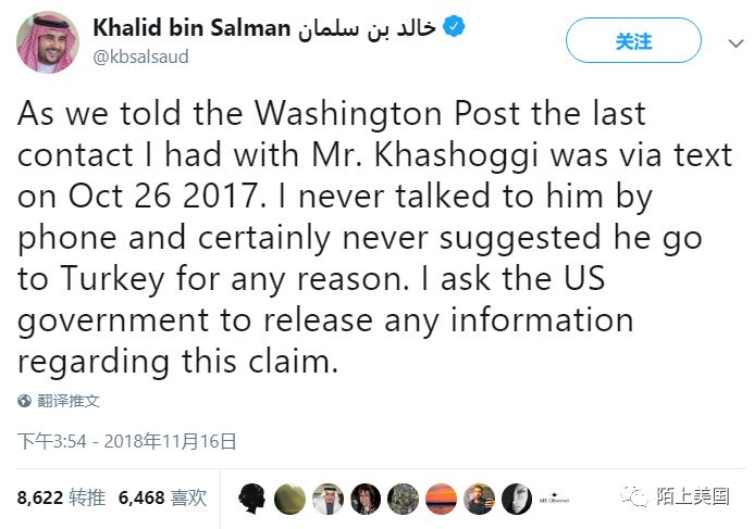 但是就像每一个罗生门事件一样,哈利德王子马上通过推特否认了自己与卡舒吉有过通话。他宣称,自己最后一次与卡舒吉有联系是2017年10月。