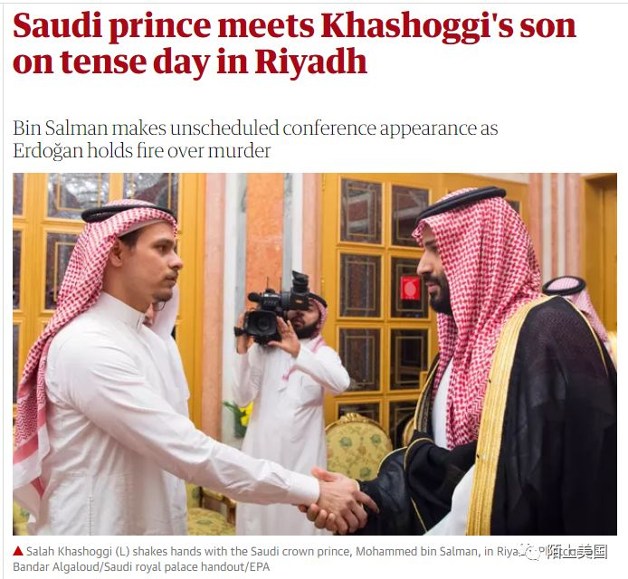 沙特为了保住王储,给出各种自相矛盾的掩盖和辩解。期间,MBS还接见“慰问”了卡舒吉的儿子。不过看照片,这两位的肢体语言,有一百个别扭。左边似乎被核弹头顶着才不得不去,右边王储,胡须里都透着阴森。
