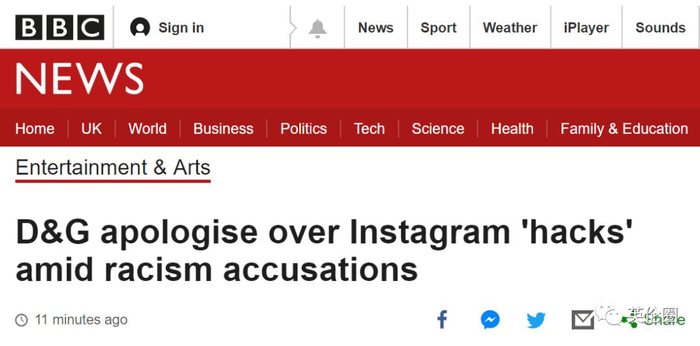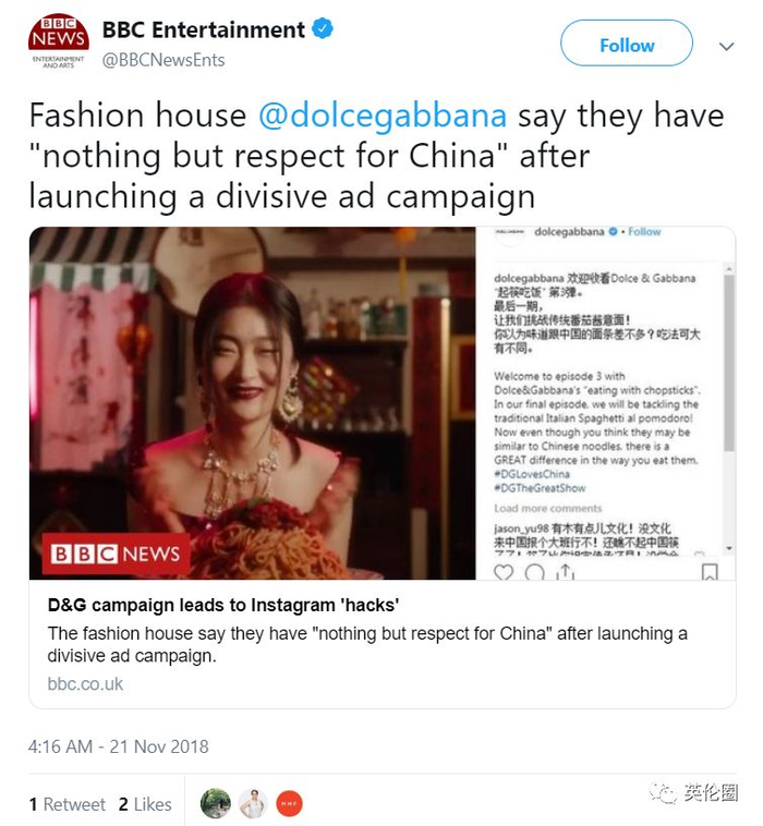BBC:D&G涉种族歧视,并为Instagram被“黑”一事道歉