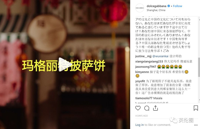 随着负面评论的增加,Dolce & Gabbana的官方微博很快删除了这些视频,但instagram、FaceBook页面上仍然存在。于是,很多人又跑到ins那里留言。