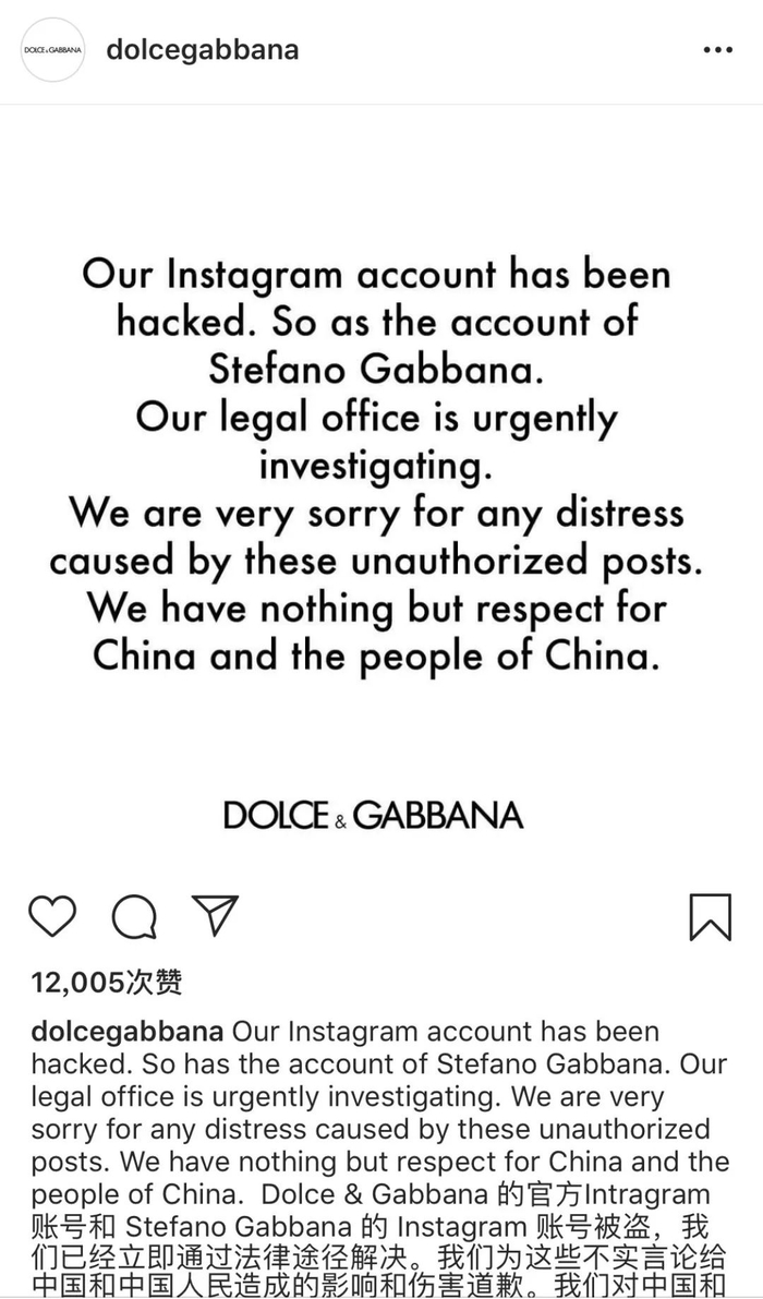 D&G解释自己是试图通过中国元素为主题的活动和产品来传达友好的信息,但结果也不尽人意。