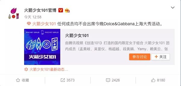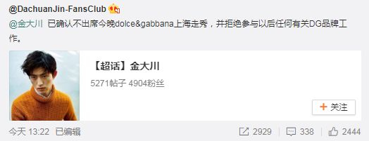 随着该事件的持续发酵,章子怡、黄晓明、陈坤、李冰冰、木子洋、王俊凯、唐艺昕、火箭少女、迪丽热巴、王大陆、胡兵等等明星表示,不会出席今晚的D&G杜嘉班纳大秀。