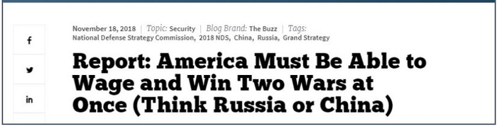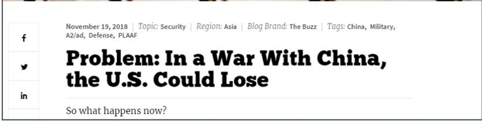 就在本周,两个独立的政府委员会不约而同地发布了报告,其论调惊人一致,那就是一再强调:中华人民共和国对美国的威胁与日俱增,将“中国威胁论”再一次推向高潮。《国家利益》中的评论也纷纷切中报告肯綮,将几百页的报告概括成一句就是:在与中国的战争中,美国要输!!