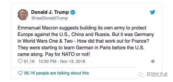 特朗普还在社交媒体连发数条推文,对马克龙提出的建立“欧洲军”(点击复习)表示不满。