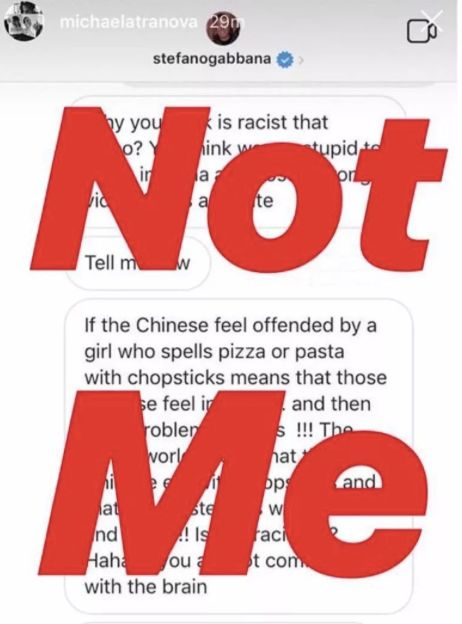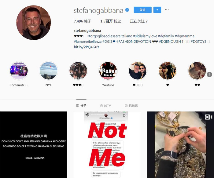 Gabbana本人的ins也发了,个人简介里也链接了油管上的道歉视频。不过跟旁边的Not Me并列在一起,感觉有点黑色幽默哪~
