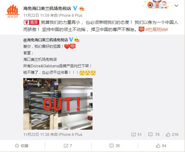 北京银泰城的DG分店大门紧锁,海口美兰机场免税店也通过官微宣布:所有杜嘉班纳品牌产品全部下架。