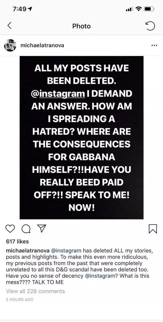 昨天,当爆料Gabbana侮辱性语言截图的ins用户Tranova打开Instagram的时候,发现自己关于Gabbana聊天的内容已经被平台删除,ins只给她留下了这样一个解释: