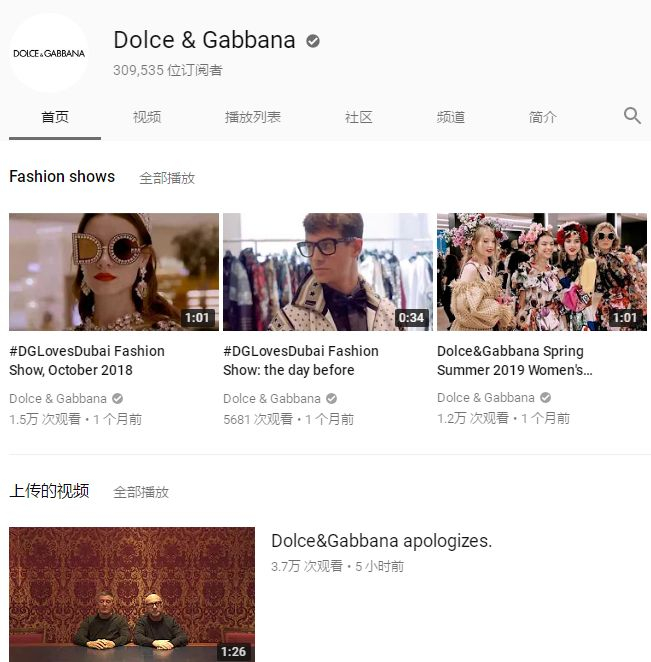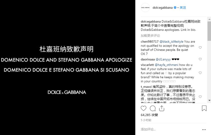DG在自己的ins和油管上也上传了道歉视频。