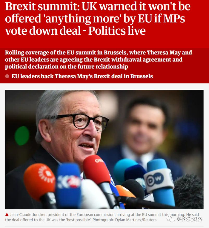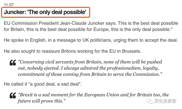 欧盟委员会主席容克说:“这是交易,这是最好的交易,欧盟在这个问题上不会改变其基本立场,所以我认为英国议会,因为这是一个明智的议会,将批准这项协议。“