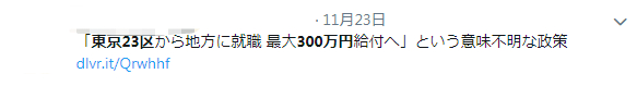 补贴制度的对象是愿意从东京23区迁出就职的人群,可领取政府的搬迁补贴,最高达300万日元。