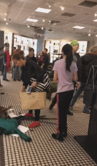 枪声响起后,现场的顾客四处逃窜寻找躲避。商店里的店员纷纷拉下闸门,将顾客引导到安全区域。