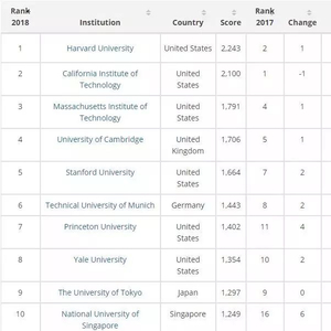 哈佛大学位列第一,而去年位列榜首的加州理工学院排名第二,麻省理工学院则排在第三位。排名前十变化较大,2017年哥伦比亚大学和波士顿大学分列第3位和第6位,但在2018年的排名中,哥伦比亚大学跌出前十,排名第14,波士顿大学则下滑至67位。