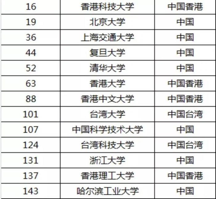 今年的榜单中,中国高校表现平稳,在上榜的150所高校中有13所中国高校,其中中国大陆7所,中国香港4所,中国台湾2所。其中香港科技大学排名最高,位列第16位,北京大学和上海交通大学紧随其后,分列第19和第36位。
