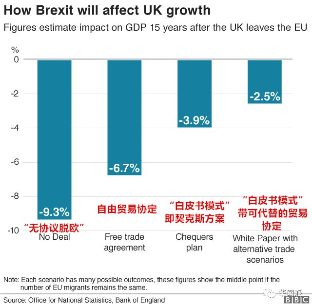 BBC还专门做了一张图,对比了四种模式对英国经济影响的对比图,第二种契克斯方案也就是“白皮书模式”。