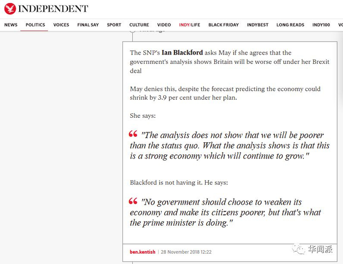 辩论中最具争议的一段要数苏格兰民族党议员Ian Blackford的提问。该议员提问,根据英国政府今天公布的分析报告,梅的“脱欧”方案是否会给经济带来负面冲击。