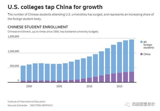 中国留学生已经占了美国国际学生32%以上,由于中美关系的紧张,中国留学生赴美的数量2017年首次出现下滑。